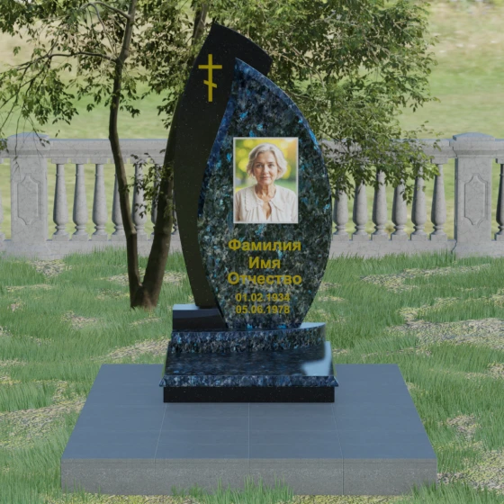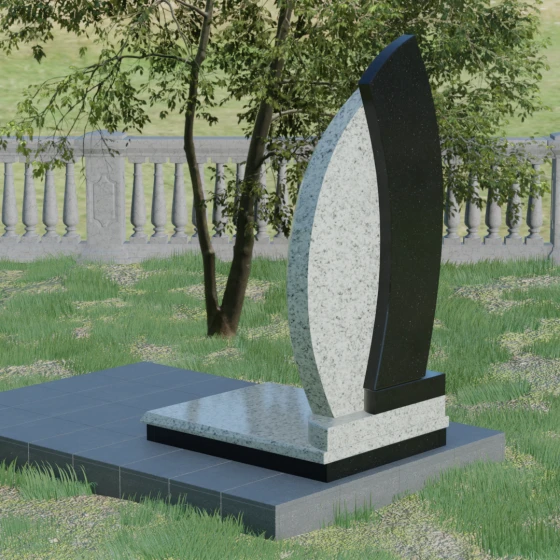 Геометрия модели выстроена на сочетании двух различных пород камня, что позволяет добиться уникальной глубины восприятия. Мы предлагаем этот проект в 8 цветовых вариациях, используя лучшие сорта природного материала: величественный гранит амфиболит, изысканный Балтик грин, мерцающий Блю Перл, классический Габбро-диабаз, насыщенный Дымовский, яркий Лезниковский, светлый Мансуровский или белоснежный мрамор Тассо. Такое разнообразие палитры — это не просто эстетический выбор, а возможность отразить уникальный характер и темперамент покойного, подобрав камень, который будет резонировать с его жизненным путем.