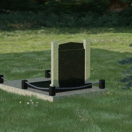 Особого внимания заслуживает полное благоустройство участка, входящее в концепцию модели 011. Памятник устанавливается на массивный гранитный цоколь, который придает всей конструкции устойчивость и защищает её от сезонных подвижек грунта. Вместо открытого цветника здесь используется сплошная надгробная плита, закрывающая всю площадь захоронения. Это создает эстетически законченный, строгий вид и значительно упрощает уход за могилой — вам не придется бороться с сорняками или обновлять засыпку. Завершают композицию аккуратные каменные столбики с декоративными цепями, которые обозначают границы частного пространства, создавая атмосферу уединения и покоя.