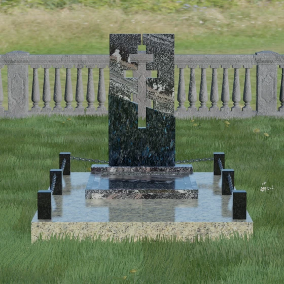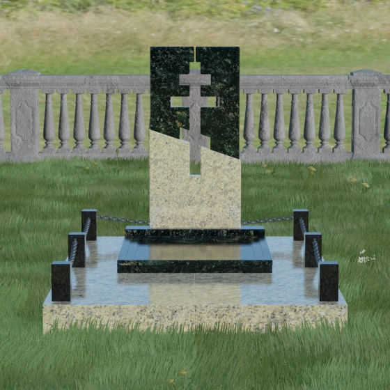Данная модель — это торжество современной архитектуры и глубокого сакрального смысла. В центре композиции находится величественная стела, состоящая из двух контрастных блоков, разделенных динамичной диагональной линией. Этот художественный прием символизирует границу между земным и вечным, светом и тенью. Главной особенностью изделия является филигранная сквозная резьба: в самом сердце камня вырезан православный восьмиконечный крест. Лаконичность форм подчеркивает строгость и достоинство, а отсутствие лишнего декора позволяет сфокусироваться на главном символе веры.