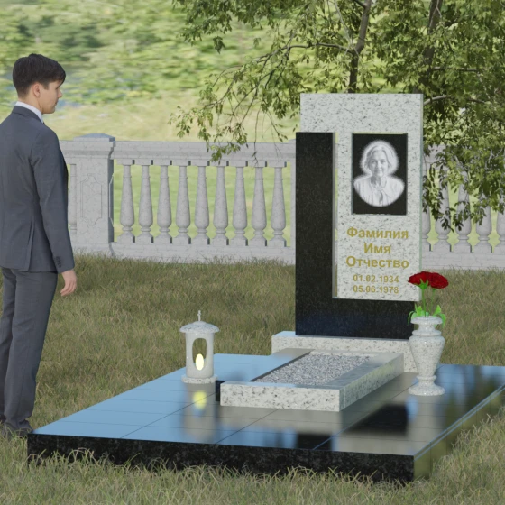 Целостность мемориального комплекса обеспечивается продуманным благоустройством. Стела устанавливается на массивный каменный постамент, который служит надежным фундаментом. Композицию гармонично дополняют аксессуары из аналогичного камня: точеная гранитная ваза для живых цветов и закрытая лампада, подчеркивающие аккуратность и ухоженность места захоронения. Сплошная надгробная плита, выполненная в едином стиле, придает участку завершенный вид и препятствует прорастанию сорной травы, сохраняя эстетику ландшафта в любое время года.