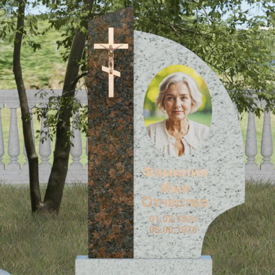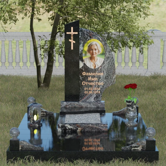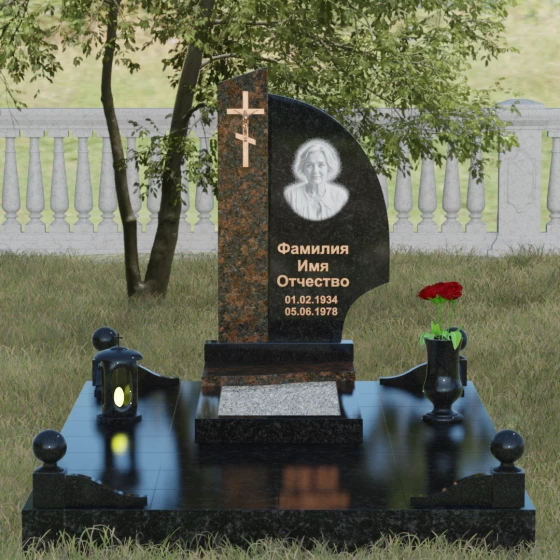Оформление и советы искусствоведа: Для данной модели идеально подходит гравировка портрета в овальном или круглом формате, размещенная в верхней части «волнообразной» стелы. Это уравновешивает массивность левой части с крестом. Текст (ФИО и даты) рекомендуется выполнять глубоким академическим шрифтом с последующим покрытием сусальным золотом или «под бронзу», чтобы поддержать цветовую гамму распятия. Зеркальная полировка камня обеспечит четкость гравировки, которая не потускнеет и через сто лет, требуя лишь минимального ухода — протирки мягкой ветошью.