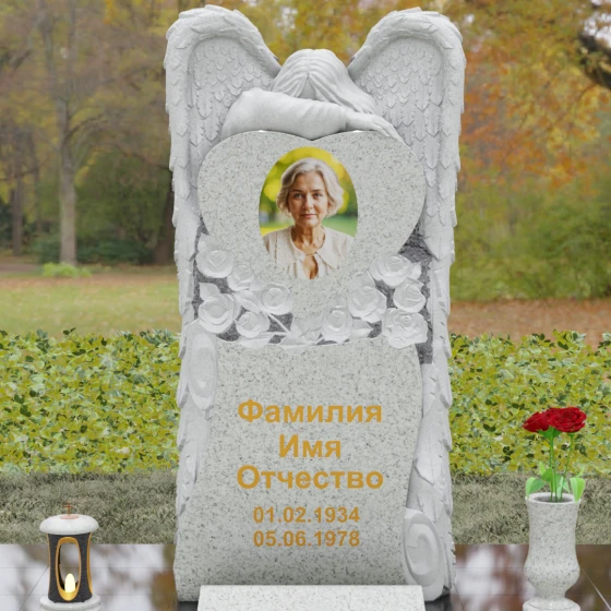 Особое внимание уделено флористическим мотивам. В основании «сердца» вырезаны объемные бутоны роз. Их лепестки, выполненные в технике глубокого барельефа, кажутся живыми и нежными, несмотря на твердость материала. Эти цветы не просто украшают изваяние, они олицетворяют вечную любовь, которая не увядает со временем. Плавные, текучие линии стелы гармонично сочетаются с архитектурной строгостью основания, создавая завершенный и эстетически безупречный ансамбль.