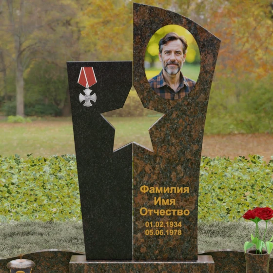 Оформление: Для данной модели рекомендуется использование высокохудожественной лазерной или ручной гравировки портрета на темном полотне камня. Золочение букв эпитафии идеально дополнит образ звезды и ордена, создавая торжественный и статусный вид. Широкое поле правого блока позволяет разместить не только даты жизни, но и важные слова, которые останутся в камне навсегда.