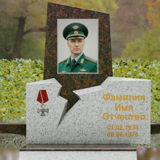 Представленная вашему вниманию величественная стела (Артикул 187) — это не просто мемориальный знак, а глубокое художественное произведение, в котором запечатлена эстетика мужества и непоколебимой воли. Композиция построена на резком, драматичном контрасте двух видов камня и сложных геометрических форм. Верхний сегмент, выполненный из глубокого черного гранита с зеркальной полировкой, устремлен ввысь, символизируя чистоту помыслов и вечный покой. Его асимметричный срез придает монументу динамику и современный вид. Нижняя часть комплекса, созданная из фактурного красно-коричневого гранита, олицетворяет земную твердь и крепость характера. Особого внимания заслуживает художественный разлом — рваная, зигзагообразная линия соприкосновения двух плит. Этот «разлом времени» выглядит максимально натуралистично, создавая визуальное ощущение мощи, способной преодолеть саму смерть. На левой стороне мемориала гордо расположена объемная резьба в виде ордена Мужества с алой лентой, что подчеркивает особый статус и заслуги усопшего.