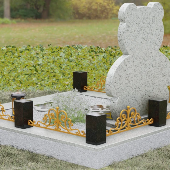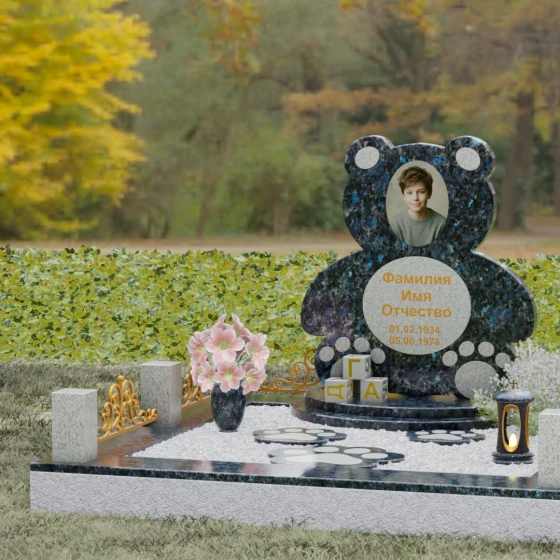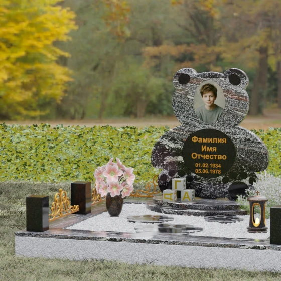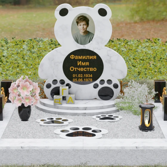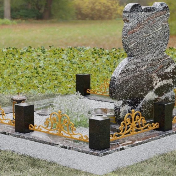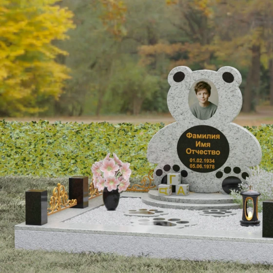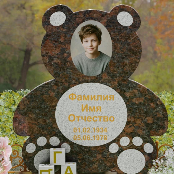 Представленное надгробие из натурального камня (Артикул 235) — это подлинное произведение мемориального искусства, в котором монументальность гранита встречается с трогательной нежностью художественного образа. Силуэт памятника выполнен в форме стилизованной фигуры медвежонка, что мгновенно переводит восприятие из плоскости строгой скорби в область светлых, чистых воспоминаний о невинности и искренности. С точки зрения искусствоведа, выбор такой формы является глубокой аллегорией вечной защиты и неувядающей любви: округлые, мягкие линии стелы лишены острых углов, что символизирует бесконечность и гармонию.