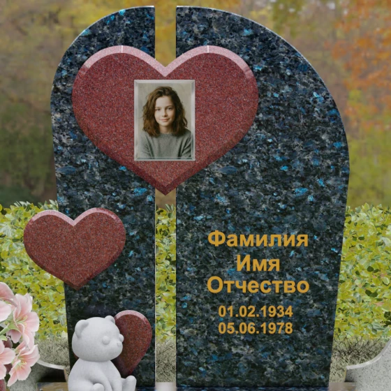 Каждая линия этой модели наполнена глубоким смыслом. Разделенная на две части стела символизирует границу между двумя мирами, а объединяющее их сердце — торжество любви над временем и забвением. Фигура медвежонка у подножия — символ чистоты, беззащитности и невинной души, что часто выбирают для оформления захоронений самых дорогих и рано ушедших близких. Использование контрастных цветов камня подчеркивает многогранность человеческой жизни, где есть место и глубокой скорби, и светлым воспоминаниям. Этот памятник не просто обозначает место покоя, он рассказывает историю глубокой привязанности, которая не исчезает с годами.