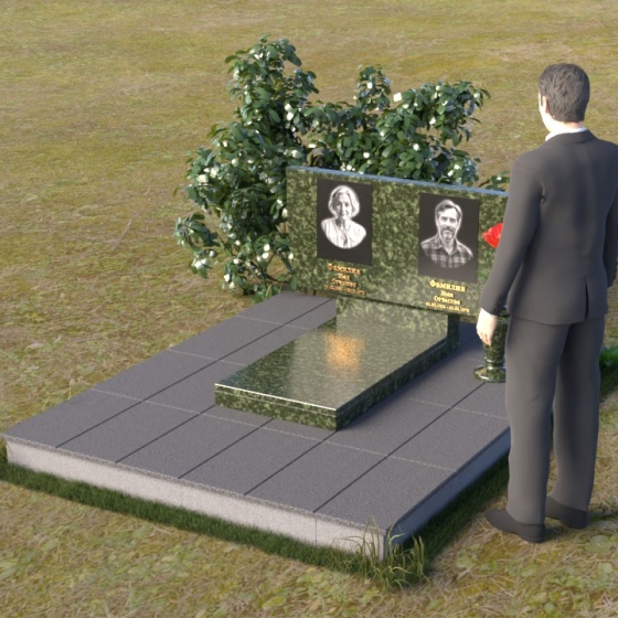 Это ритуальное изделие представляет собой гармоничное сочетание прямых линий и мягких, едва уловимых изгибов, создающих ощущение покоя и умиротворения. Стела имеет прямоугольную форму, но ее верхняя грань слегка скошена, что придает ей визуальную легкость и динамику. Обратите внимание на зеркальную полировку лицевой стороны – она отражает небо и окружающий мир, словно заключая в себе вечность. На полированной поверхности выгравированы портреты усопших и памятные надписи, выполненные с высокой точностью и детализацией. Слева от стелы, на основании, располагается небольшая горизонтальная плита с аналогичной полировкой, создающая дополнительное пространство для цветов или памятных предметов. Основание памятника выполнено из серого камня с матовой фактурой, что создает контраст с блестящей стелой и придает композиции устойчивость и завершенность. Рядом с плитой установлена ваза, выполненная из того же черного полированного гранита, что и стела, что обеспечивает единство стиля и служит достойным обрамлением для живых цветов, символизирующих вечную память.