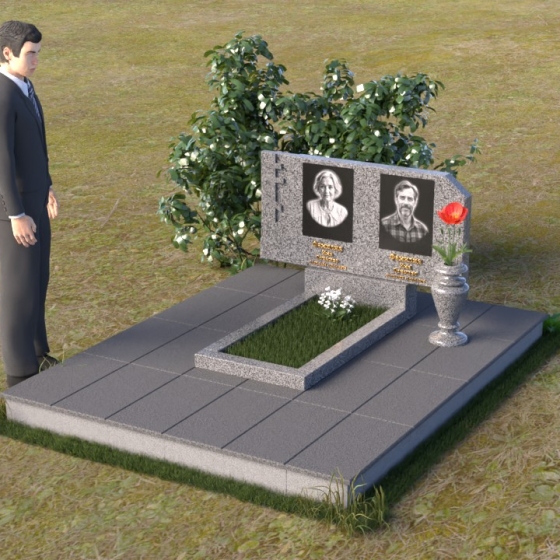 В верхней части памятника располагается вертикальная стела прямоугольной формы с небольшими скошенными углами, придающими ей более мягкий и благородный вид. На поверхности стелы размещены два портрета усопших, выполненные с высокой детализацией. В левом верхнем углу вырезано изображение православного креста, выполненного в лаконичном стиле, подчеркивающем сдержанность и глубину веры. Справа от портретов вырезана изящная роза с детально проработанными лепестками, символизирующая любовь и вечную память. Нижняя часть стелы плавно переходит в горизонтальную плиту, на которой размещается табличка с именами и датами жизни усопших. Горизонтальная плита, в свою очередь, опирается на строгий постамент, обеспечивающий устойчивость всей конструкции.