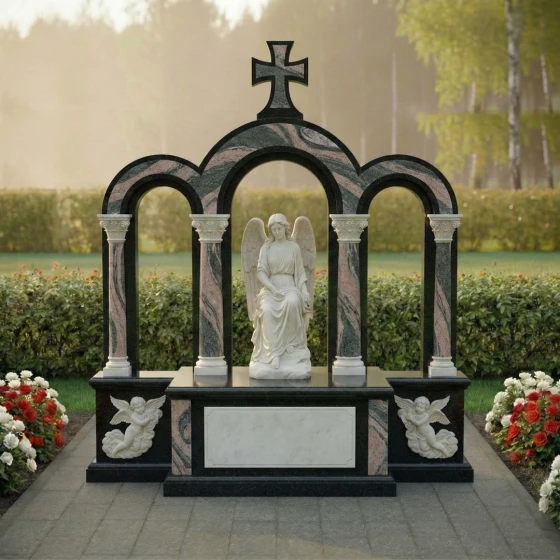 Кому подойдет: Эта мемориальная композиция идеально подойдет для тех, кто ищет не просто надгробный знак, а настоящее произведение мемориального искусства, способное выразить глубокую скорбь и вечную любовь. Она станет достойным воплощением памяти о человеке, чья жизнь была наполнена светом, верой и достоинством. Величественная аркада, символизирующая переход в иной мир, и фигура ангела, олицетворяющая чистоту души, делают эту композицию идеальным выбором для увековечения памяти о близком человеке, чья жизнь оставила неизгладимый след. Мемориальная композиция ПН 044 доступна для заказа в 8 цветовых решениях, что позволяет подобрать материал, наиболее точно отражающий характер и индивидуальность усопшего. Вы можете выбрать один из семи видов гранита: гранит Амфиболит с его глубоким черным цветом, величественный Балтик Грин, благородный Блю Перл, классический Габбро-диабаз, теплый Дымовский, изысканный Лезниковский или светлый Мансуровский. Также доступен мрамор Тассо, который придаст композиции особую нежность и утонченность. Такой широкий выбор материалов дает возможность создать по-настоящему уникальный и персонализированный мемориал, созвучный духу и памяти усопшего.