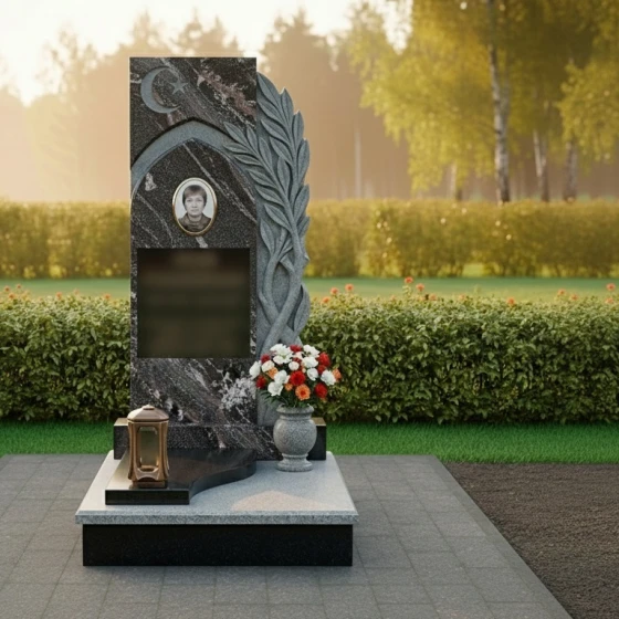 Оформление: Строгая вертикальная форма основной стелы идеально подходит для размещения гравированного портрета и полных данных усопшего. Портрет, выполненный методом лазерной гравировки, будет выглядеть особенно выразительно на фоне зеркальной полировки, а четкие, хорошо читаемые буквы ФИО и дат жизни и смерти гармонично впишутся в отведенное для них пространство. Для сохранения чистоты и выразительности резных элементов мы рекомендуем размещать гравировку на основной, полированной части стелы, оставляя рельефную ветвь нетронутой, чтобы ее красота была максимально раскрыта.