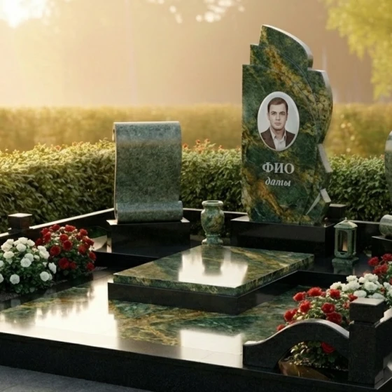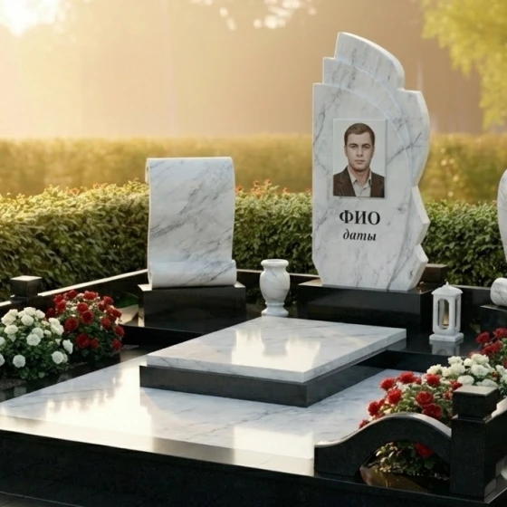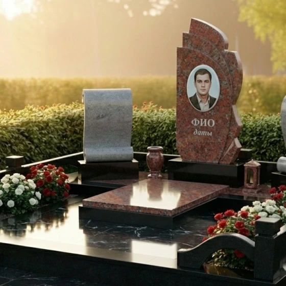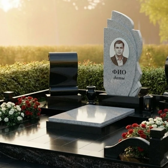 Оформление: Для данной формы монумента идеально подходят как классические, так и современные стили гравировки. Портрет усопшего, выполненный в технике фотогравировки на зеркально отполированной поверхности, будет выглядеть особенно выразительно и реалистично. Рекомендуется размещать портрет в верхней части центральной плиты, а под ним — ФИО и даты жизни, выполненные элегантным шрифтом, который гармонично сочетается с общим стилем монумента. Можно также рассмотреть возможность добавления небольшого символического элемента, такого как ветвь, цветок или крест, в нижней части плиты, чтобы усилить эмоциональное воздействие.