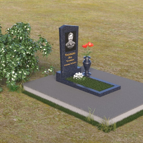 Этот гранитный монумент представляет собой композицию из двух основных элементов: вертикальной плиты с портретом и горизонтальной накладки. Вертикальная плита, возвышающаяся над землей, имеет строгую прямоугольную форму с небольшим скосом в верхней части. Это придает монументу сдержанную элегантность. Зеркальная полировка поверхности отражает свет, создавая ощущение глубины и сияния. На плите выгравирован портрет усопшего, выполненный с высокой точностью и вниманием к деталям. Ниже портрета располагается надпись с именем и датами жизни, выполненная золотым шрифтом. Горизонтальная накладка, расположенная в нижней части, также выполнена из черного полированного гранита и служит своеобразным пьедесталом для вертикальной плиты. Ее гладкая поверхность создает дополнительный контраст с окружающей средой. Рядом с монументом установлена ваза из черного гранита, предназначенная для живых цветов.