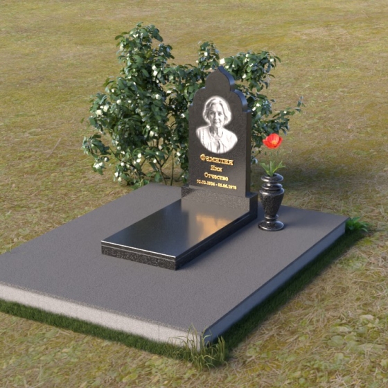 Основание композиции – прямоугольная плита с ровной, матовой поверхностью, обеспечивающая надежную устойчивость всей конструкции. На ней располагается горизонтальная плита, выполненная в виде усеченного параллелепипеда с зеркально отполированной поверхностью. Эта плита создает эффект глубины и отражает окружающий мир, словно запечатлевая моменты жизни ушедшего. Вертикальная стела возвышается над горизонтальной плитой, ее верхняя часть выполнена в форме изящной арки с плавными изгибами. Арка завершается небольшим декоративным элементом, напоминающим купол, что придает памятнику особую выразительность и духовность.