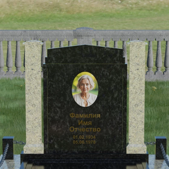 Главной особенностью данного комплекса являются две декоративные колонны, обрамляющие центральную стелу. Эти стройные вертикальные столбы не просто дополняют дизайн, но и служат символом опоры, духовной стойкости и незыблемости памяти. Контрастное сочетание фактур и цветов, представленное в разных вариациях модели, позволяет расставить акценты: выделить центральную часть для портрета или, наоборот, подчеркнуть строгость боковых пилонов. Зеркальная полировка каждой грани создает удивительную игру света — поверхность камня отражает мир вокруг, словно запечатлевая в себе само течение времени, при этом сохраняя безупречный блеск на многие десятилетия.