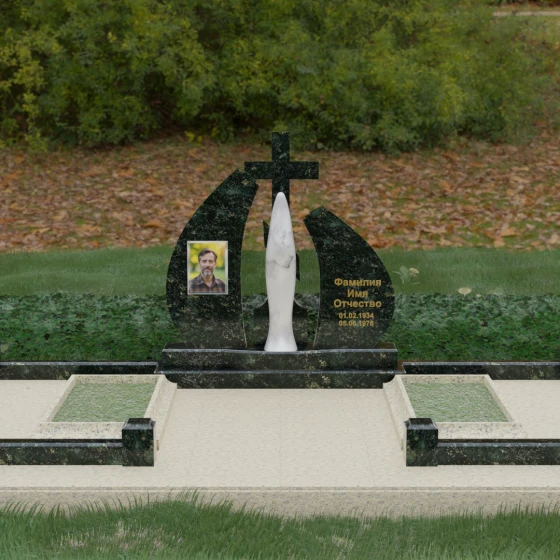 Особое внимание привлекает игра фактур: идеально гладкая, зеркальная полировка основных плоскостей камня соседствует с матовым, бархатистым исполнением центральной статуи. Такое сочетание позволяет свету играть на гранях мемориального комплекса, создавая глубокие тени и яркие блики, что придает всей конструкции дополнительный объем и монументальность. Это решение подчеркивает статусность мемориала и его эстетическое совершенство, делая его доминантой на месте захоронения.