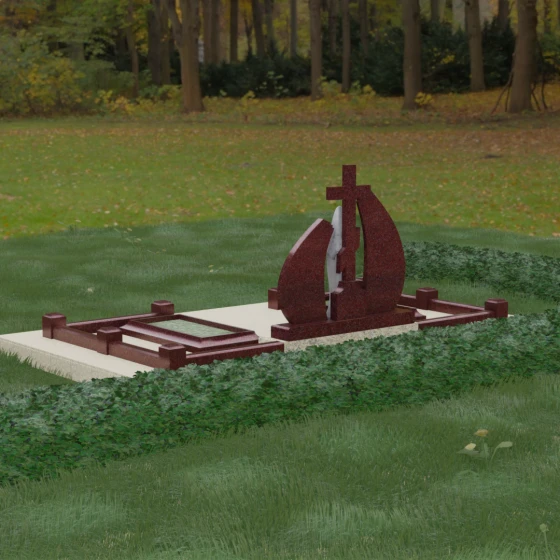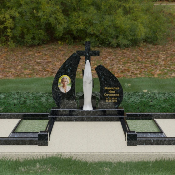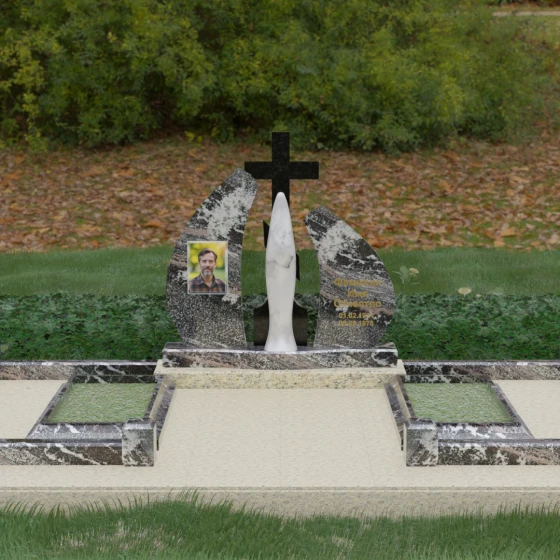 Эта величественная стела представляет собой не просто мемориальный знак, а глубоко продуманную художественную композицию, в которой каждая линия наполнена смыслом. Центральным элементом мемориала является изящная скульптура Скорбящей матери, выполненная в мягком белом цвете. Её плавный силуэт, напоминающий застывшую молитву, контрастирует со строгим и лаконичным православным крестом, венчающим композицию. Форма боковых элементов стелы напоминает два крыла или два лепестка пламени, которые бережно обрамляют центральную фигуру, создавая ощущение защиты и вечного покоя.