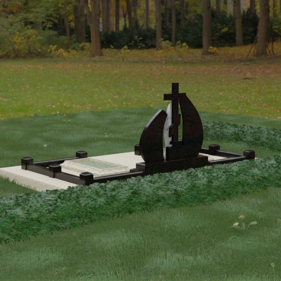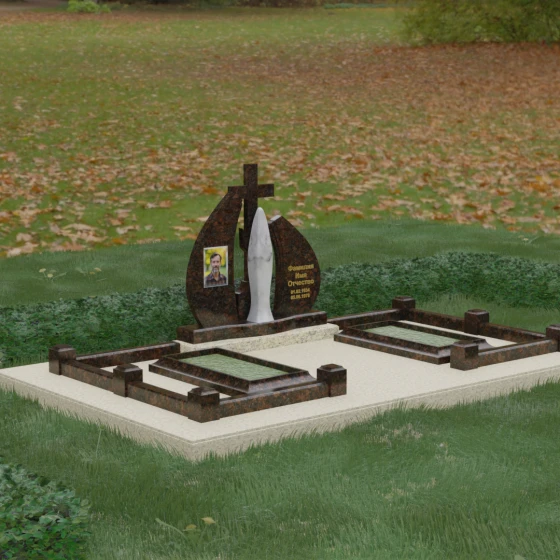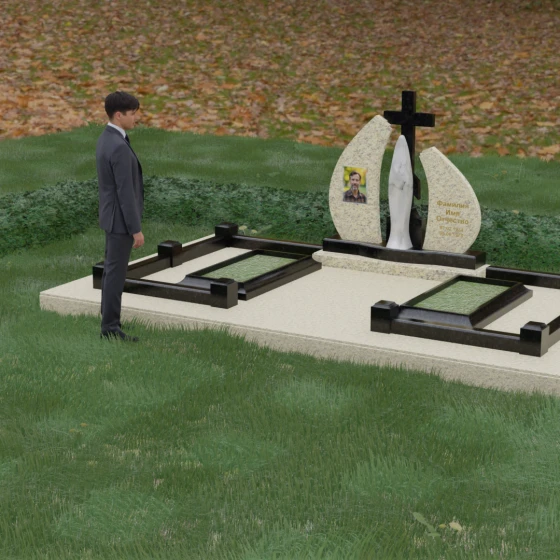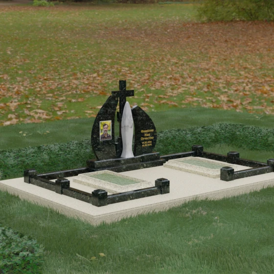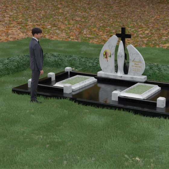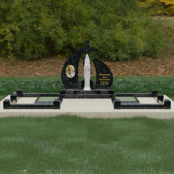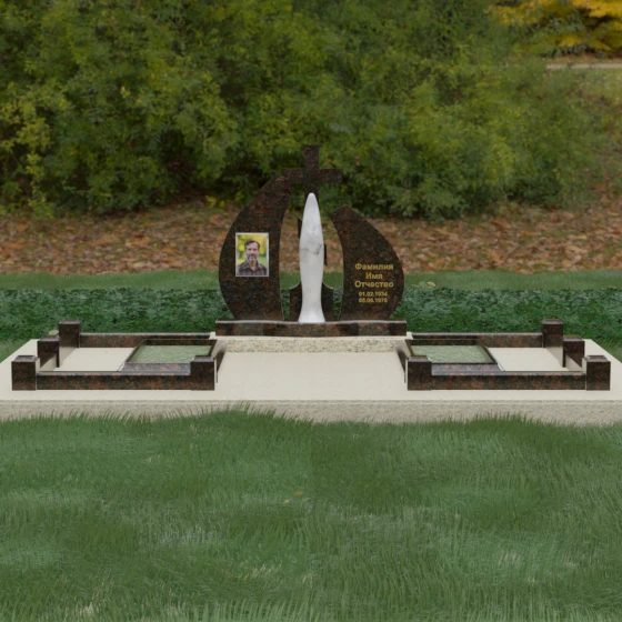 Внутри периметра предусмотрены два симметричных открытых цветника, которые позволяют внести живые краски в строгую геометрию камня. Конструкция стелы идеально сбалансирована для размещения парных портретов или надписей. Левое «крыло» традиционно отводится под гравировку портрета, где на темном полированном фоне изображение будет выглядеть максимально четким и контрастным. Правая часть предназначена для эпитафии и имен, нанесенных глубокой гравировкой с возможным золочением букв. Весь ансамбль продуман так, чтобы передать теплоту ваших чувств и сохранить память о дорогих людях в самом достойном виде.