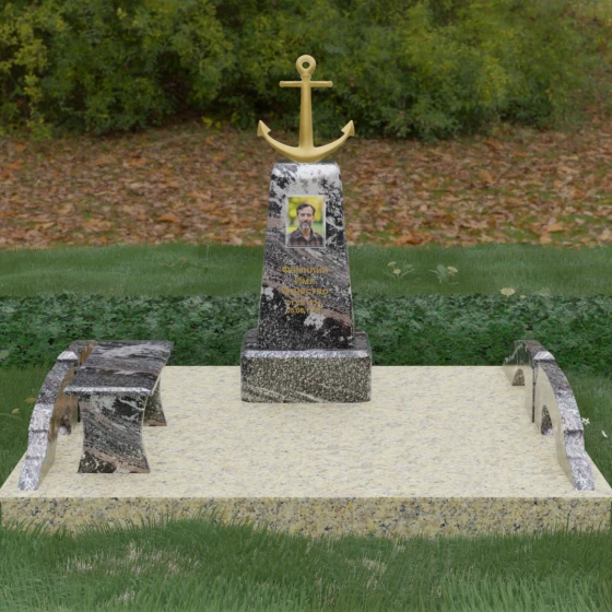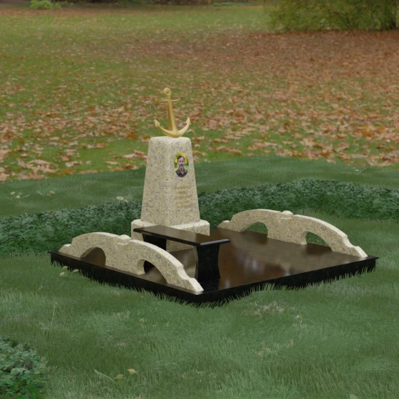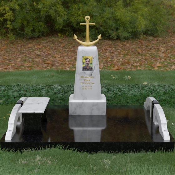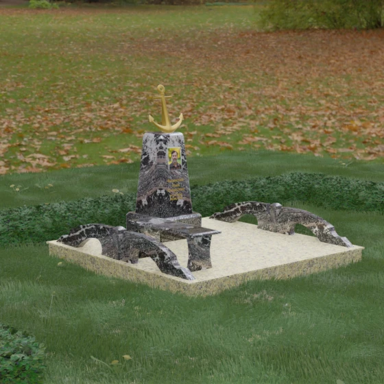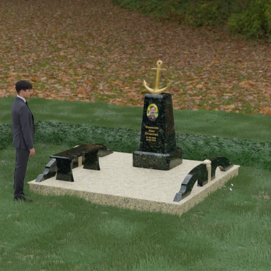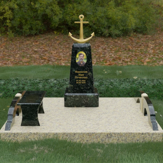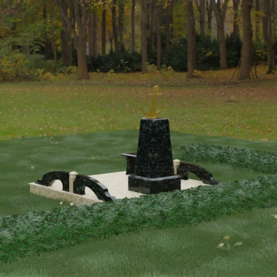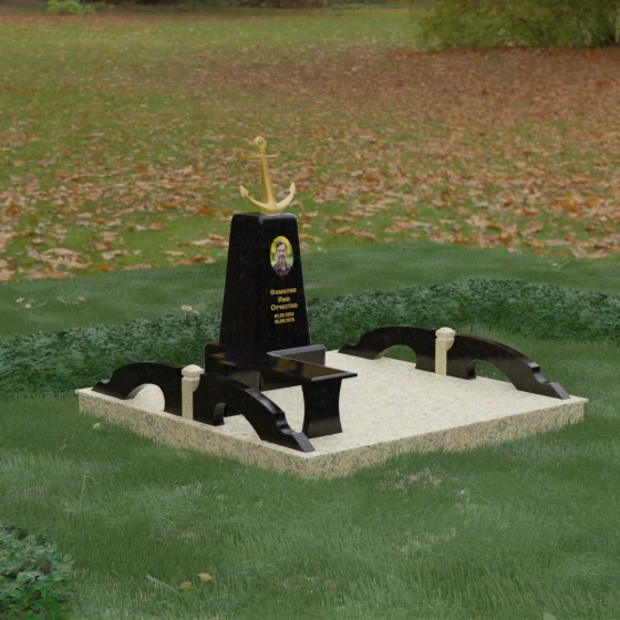 Художественное исполнение монумента строится на тонкой игре контрастов. Зеркальная полировка глубокого черного камня (в базовом варианте) отражает окружающий мир, создавая ощущение глубины и чистоты. В то же время рельефный якорь и золоченая гравировка вносят в композицию теплоту и торжественный блеск. Плавные изгибы боковых элементов и ножек скамьи символизируют бесконечность жизненного пути и гармонию, смягчая строгость центрального обелиска. Каждая грань камня обработана с безупречной точностью, что обеспечивает не только эстетическую привлекательность, но и долговечность изделия.