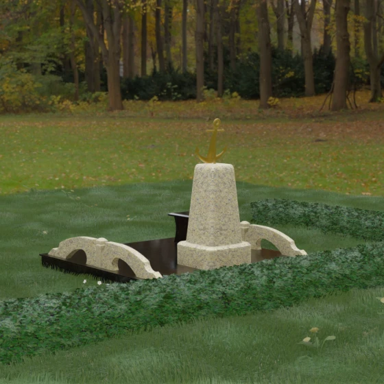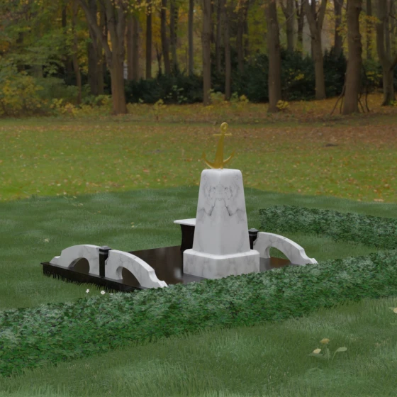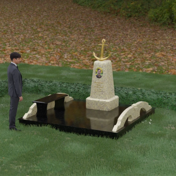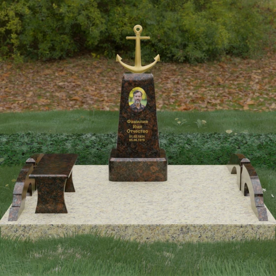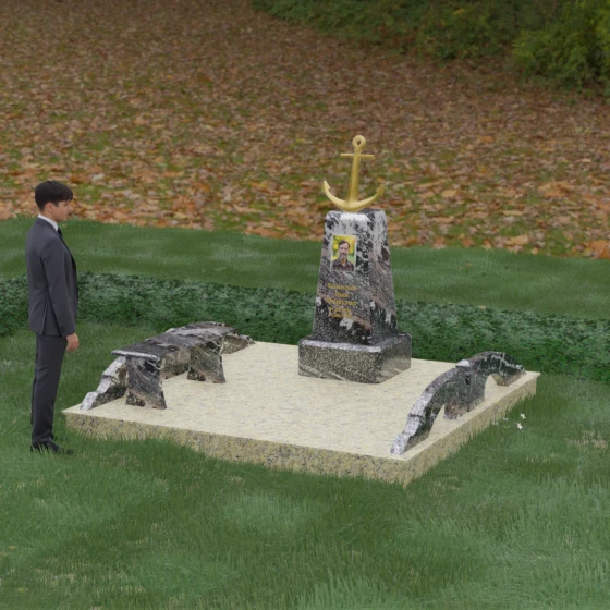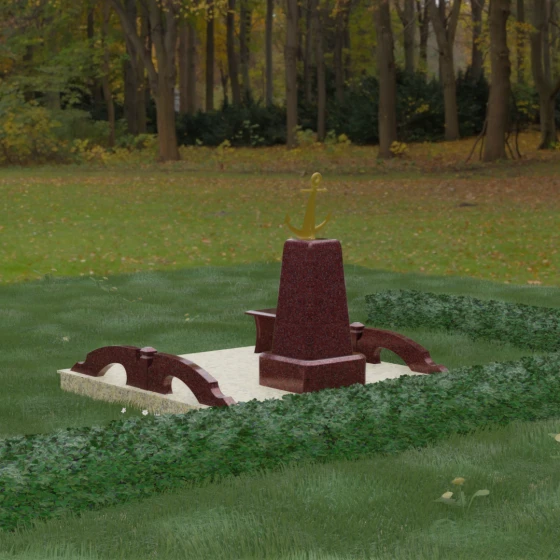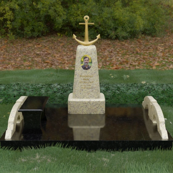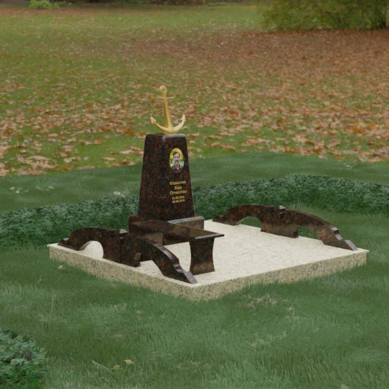 Представленная мемориальная композиция под артикулом 179 — это не просто дань памяти, а глубокое архитектурное высказывание, воплощенное в благородном камне. Центральное место в ансамбле занимает величественная стела, форма которой напоминает строгий и уверенный постамент. Её сужающиеся кверху грани создают эффект устремленности ввысь, подчеркивая монументальность и торжественность образа. Венчает конструкцию массивный золоченый якорь — символ надежды, твердости духа и верности своему причалу. Этот декоративный элемент, выполненный с высокой степенью детализации, становится смысловым центром, указывая на профессиональный путь или сильный характер усопшего.