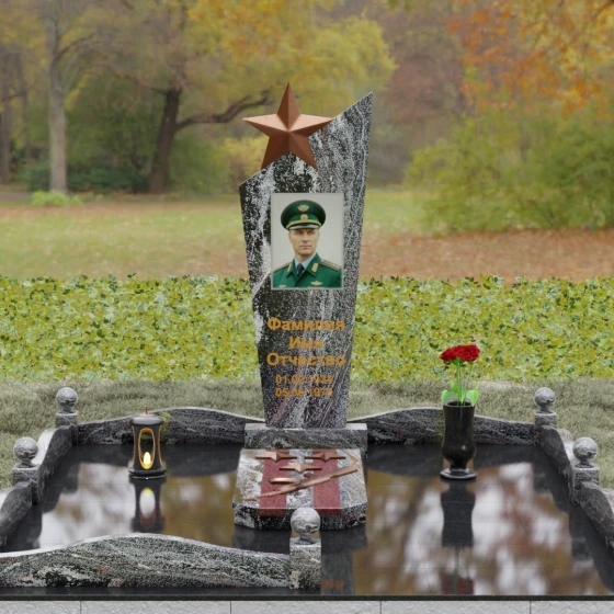 Основу композиции составляет массивное каменное полотно с уникальной асимметричной геометрией. Верхний край обелиска уходит в резкий диагональный подъем, создавая динамичный силуэт, устремленный к небесам. Венчает эту вершину объемная пятиконечная звезда — символ, выполненный в теплом бронзовом оттенке, который эффектно контрастирует с основным цветом камня. Зеркальная полировка лицевой грани доведена до эталонного блеска: поверхность буквально оживает, отражая окружающий мир и создавая глубину, в которой запечатлен портрет. Прямые, строгие линии боковых граней подчеркнуты аккуратными фасками, что придает всей конструкции архитектурную завершенность и визуальную легкость при сохранении колоссальной физической прочности.