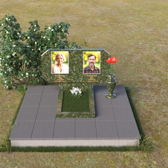 Композиция памятника строится на контрасте строгих геометрических форм и плавных линий, символизирующих жизненный путь и обретение покоя. Стела имеет форму, близкую к прямоугольнику, но с элегантно скошенными углами, смягчающими ее строгость. Верхняя часть стелы имеет две небольшие грани, словно фацеты драгоценного камня, добавляющие ей изысканности. Поверхность камня отполирована до зеркального блеска, что подчеркивает глубину черного цвета и создает ощущение торжественности. На лицевой стороне размещены портреты усопших, выполненные с высокой степенью детализации. Ниже портретов выгравированы надписи, выполненные строгим шрифтом. Справа от стелы установлена небольшая ваза, выполненная в том же стиле, что и памятник, и украшенная простым, но элегантным орнаментом.