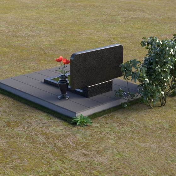 Особое внимание привлекает игра света и тени на полированных гранях. Лучи солнца, скользя по поверхности, создают эффект объема, подчеркивая глубину и фактуру камня. Стела водружена на основание, состоящее из двух элементов: горизонтальной плиты, выполненной в той же зеркальной полировке, что и стела, и более широкой подставки серого цвета с матовой фактурой, разделенной на прямоугольные сегменты. Такое решение создает ощущение надежности и основательности, подчеркивая вечность памяти. Рядом со стелой располагается ваза из черного гранита, выполненная в классическом стиле, предназначенная для живых цветов – символа жизни и продолжения памяти.