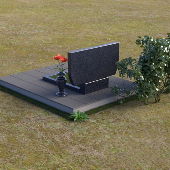Горизонтальная плита, расположенная перед стелой, служит дополнительным элементом композиции, объединяя все части в единое целое. Ее полированная поверхность также отражает свет, создавая ощущение простора и легкости. Тумба, выполненная из того же материала, что и стела, обеспечивает устойчивость всей конструкции. Основание памятника выполнено из серых плит, что создает контраст с черным цветом стелы и плиты, подчеркивая их элегантность.