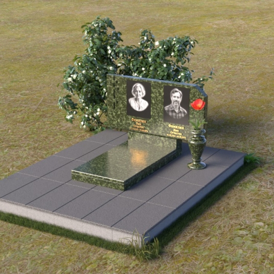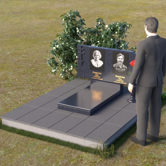 В верхней части памятника располагается вертикальная стела прямоугольной формы с небольшими скошенными углами, придающими ей более мягкий и благородный вид. На поверхности стелы размещены два портрета усопших, выполненные с высокой детализацией. В левом верхнем углу вырезано изображение православного креста, выполненного в лаконичном стиле, подчеркивающем сдержанность и глубину веры. Справа от портретов вырезана изящная роза с детально проработанными лепестками, символизирующая любовь и вечную память. Нижняя часть стелы плавно переходит в горизонтальную плиту, на которой размещается табличка с именами и датами жизни усопших. Горизонтальная плита, в свою очередь, опирается на строгий постамент, обеспечивающий устойчивость всей конструкции.
