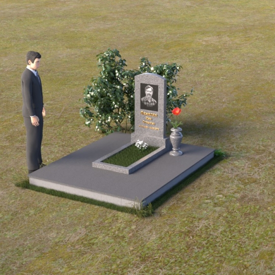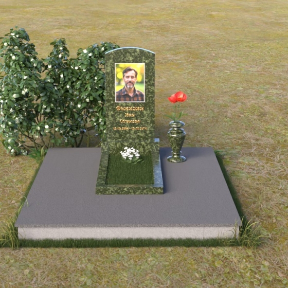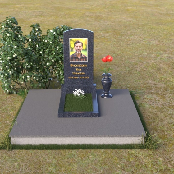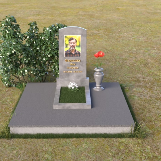 Благодаря своей лаконичной форме, эта стела предоставляет широкие возможности для оформления. Портрет усопшего будет гармонично смотреться как в верхней части стелы, так и чуть ниже центра. Золотое тиснение имени и дат жизни будет элегантно выделяться на фоне полированного камня, создавая четкий и легко читаемый образ. Небольшая тумба, расположенная перед стелой, может служить местом для возложения цветов и памятных вещей. Мы рекомендуем выбирать для этой модели сдержанные, лаконичные шрифты, которые подчеркнут общую элегантность композиции. Подумайте о возможности добавления небольшого бронзового барельефа или скульптуры, отражающей профессию или увлечения ушедшего человека. Это добавит индивидуальности и сделает место памяти еще более личным и значимым. Ваза, выполненная в едином стиле с монументом, завершит композицию и придаст ей законченный вид.