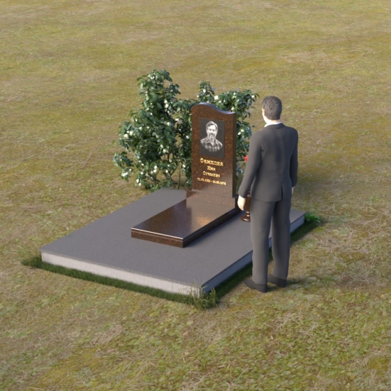 Мемориальная композиция ПВ 010 представляет собой тщательно продуманное архитектурное решение, где каждый элемент несет свою смысловую нагрузку. Стела выполнена в форме строгой, но элегантной арки, с плавным, закругленным верхом, словно стремящимся ввысь. Боковые грани стелы аккуратно скруглены, смягчая строгость формы и придавая ей ощущение спокойствия и завершенности. На лицевой стороне выгравирован портрет усопшего, выполненный с высоким уровнем детализации, а ниже – надпись с именем и датами жизни. Отдельно стоит отметить подставку под стелу. Она имеет прямоугольную форму с зеркальной полировкой, которая отражает небо и окружающий пейзаж, создавая ощущение легкости и воздушности. Скошенные фаски по периметру подставки добавляют ей изысканности и подчеркивают четкость линий.