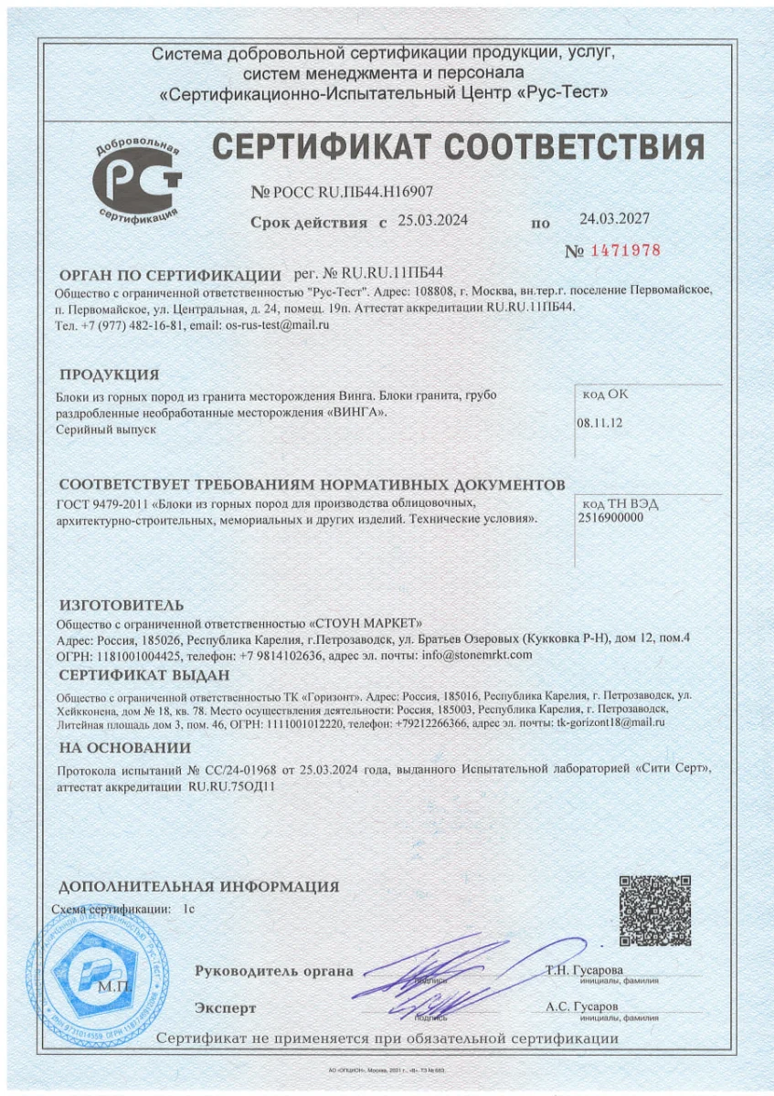 Мы хотим, чтобы вы были абсолютно уверены в качестве и безопасности материала, из которого будет изготовлен памятник для ваших близких. Поэтому мы публикуем сертификаты соответствия на основные виды гранита, которые мы используем в работе.